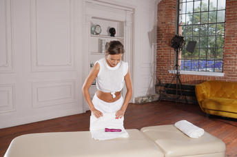 Stunning masseuse Tina Kay has a special technique to please her client. She oils up Cindy Shine’s naked body and fucks her with a dildo, driving her to orgasm after orgasm. Gorgeous Tina strips and rubs their slippery pussies together in scissors, before eating Cindy’s slick slit in a hot sixty-nine.
